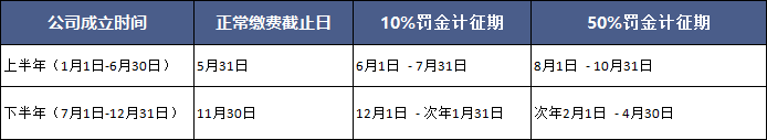 注:除了政府许可费外,企业还需向其注册代理人支付年度服务费。通常情况下,注册代理人会要求在政府截止日前至少15天收到款项,以预留处理时间。未按时支付代理费亦可能产生额外的逾期管理费。