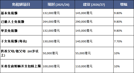 根据预算案建议,从2026/27课税年度起,多项免税额将获得显著提升,具体调整如下表所示: