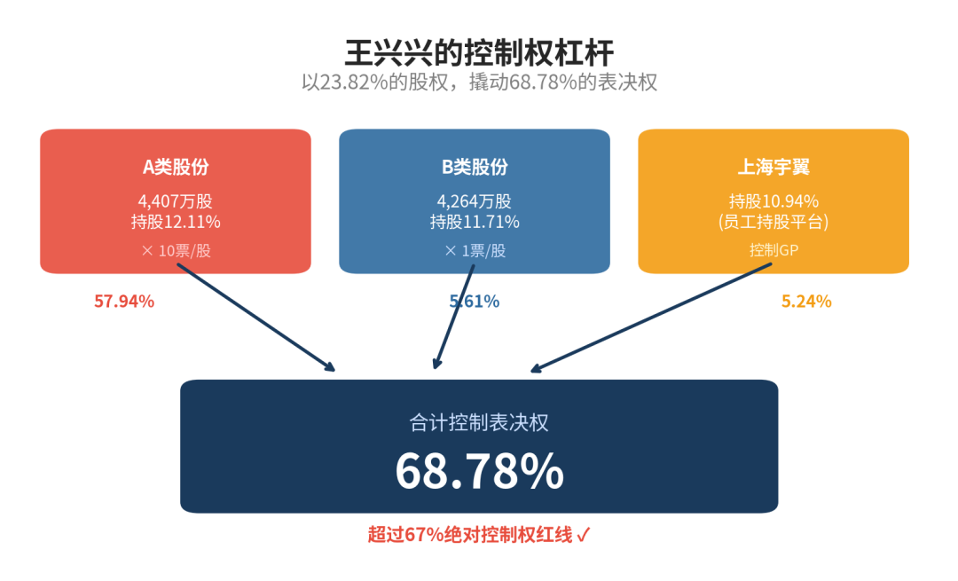 通过这一精妙的制度设计,王兴兴虽然只持有公司12.1077%的A类股份和11.7139%的B类股份(合计持股23.8216%),但其直接拥有的表决权比例却被瞬间放大到了63.5457%。