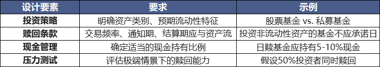 • 对于投资于非流动性资产的基金,确保有充分的时间和现金来应对赎回