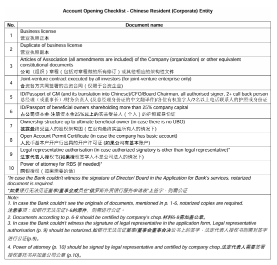 2.以便在VTB银行上海分行开立账户,需要准备哪些文件?