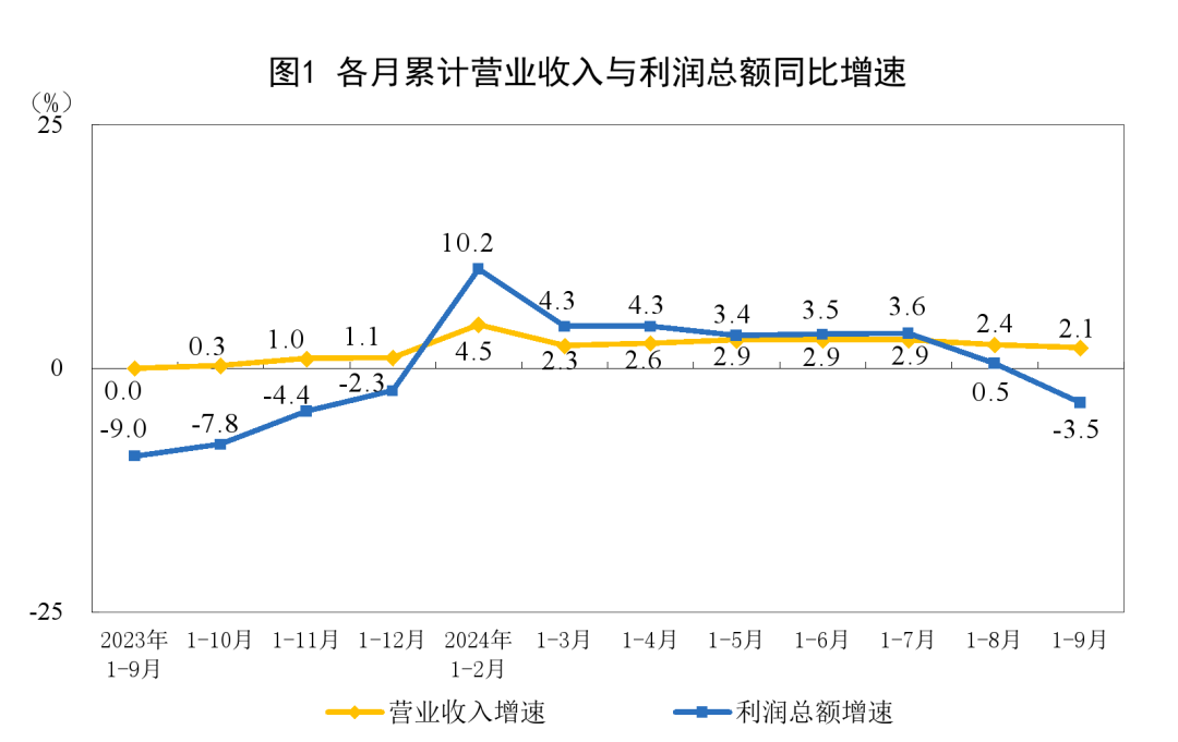 1—9月份,规模以上工业企业实现营业收入99.20万亿元,同比增长2.1%;发生营业成本84.70万亿元,增长2.4%;营业收入利润率为5.27%,同比下降0.31个百分点。