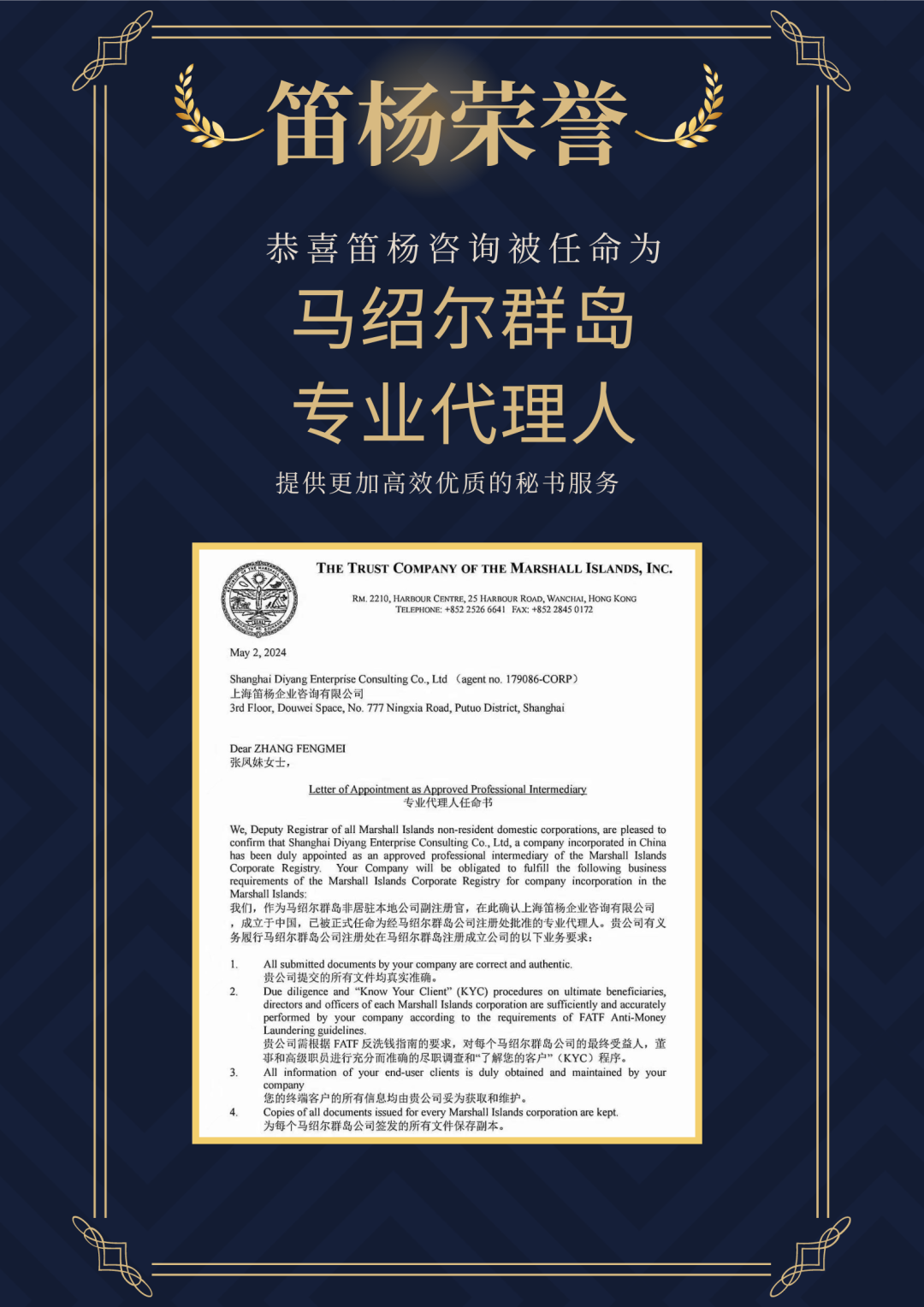 笛杨资讯|笛杨咨询被任命为马绍尔群岛专业代理人