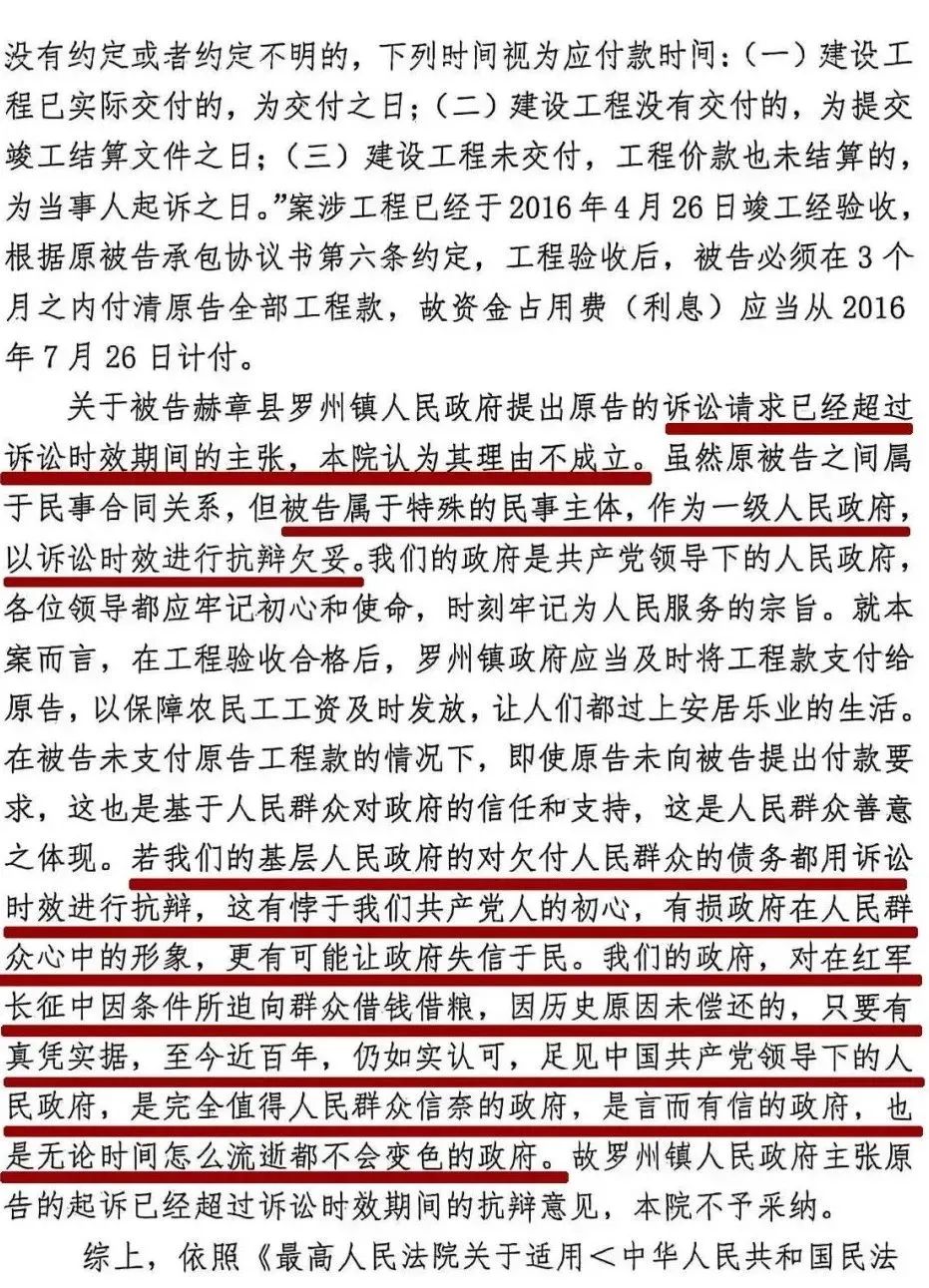 近日,一份裁判文书说理的内容开始在社交媒体流传,判决以被告是特殊的民事主体一级政府为由,驳回了其关于诉讼时效过期的诉讼请求。