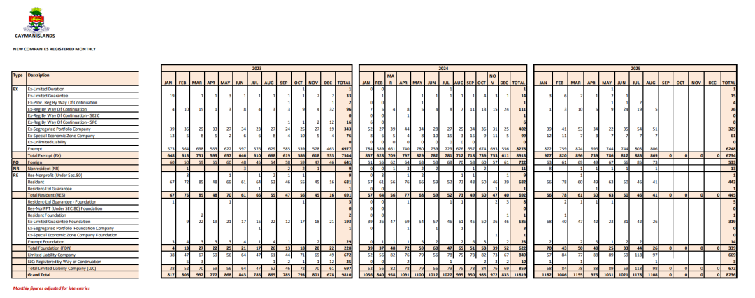总量增长趋势明确:2023年新注册公司总量为9810家,2024年增至11819家,2025年虽仅披露前几个月数据,但单月注册量多次突破千余家,全年大概率延续增长态势。这表明全球市场对开曼商业架构的需求仍在扩张;