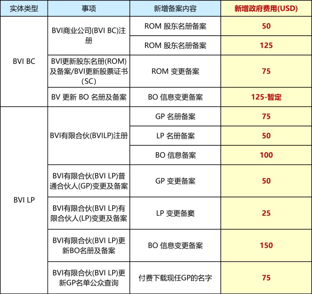 根据BVI官方的最新通知,自2025年1月1日起,BVI商业公司和有限合伙企业的注册及相关服务费用将全面上调。具体调整内容如下: