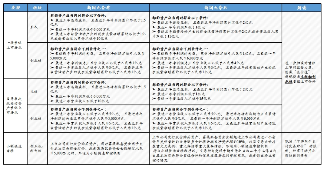 为贯彻落实新“国九条”有关上市公司并购重组的精神,沪深北交易所于4月30日发布了修订后的三个交易所《证券交易所上市公司重大资产重组审核规则》,对包括重组上市条件、 小额快速审核机制、投资者适当性管理要求等内容进行修订并征求意见。