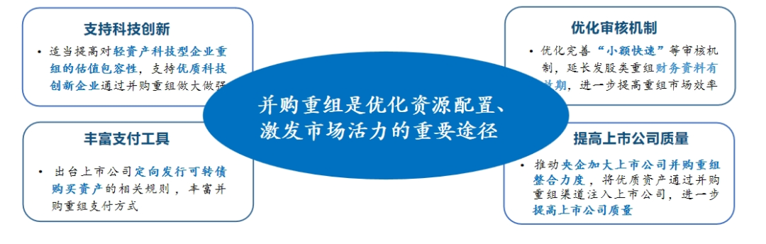· 深化上市公司并购重组市场化改革。优化完善“小额快速”审核机制,适当提高轻资产科技型企业重组的估值包容性,丰富重组支付和融资工具。