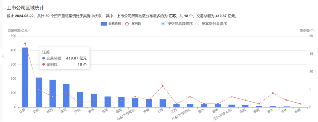 近期在会审核的重组项目,由于发达地区经济活力较高、上市公司普遍质地较好,江苏、北京等地案例数量排名靠前。
