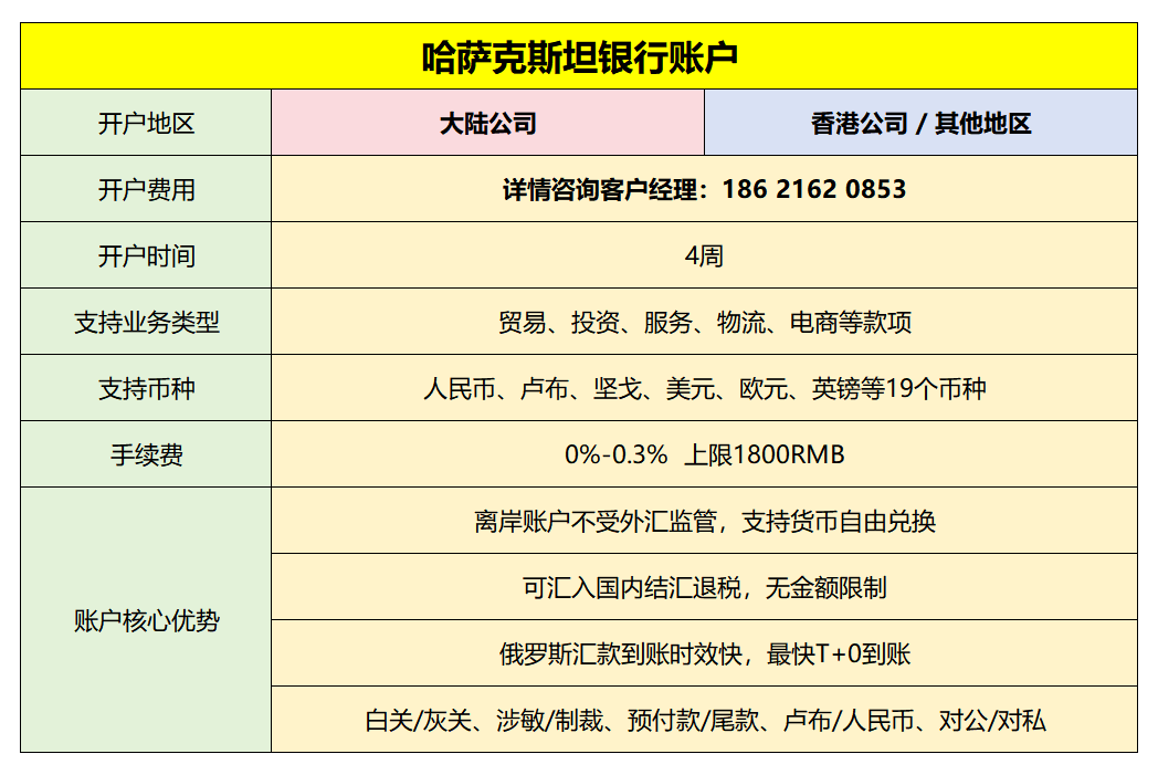 哈萨克斯坦银行账户支持大陆或香港等地区公司开户,开户时间为4周。并且支持进出口贸易、金融投资、咨询服务、货代物流、跨境电商等涉及俄罗斯业务款项。支持收付俄罗斯离岸人民币和卢布等18+币种,可在网银进行货币自由兑换。可通过用香港公司申请哈萨克斯坦银行离岸账户,用来收付俄罗斯款项,通常T+1到账,款项从俄罗斯汇出到达哈萨克斯坦银行后,可选择兑换美金后或直接转至香港银行账户,至此资金可选择汇往中国大陆进行退税结汇,或在境外自由流通。如用中国大陆公司开户,资金至哈萨克斯坦银行后可汇往国内美金账户申请退税或结汇至个人。