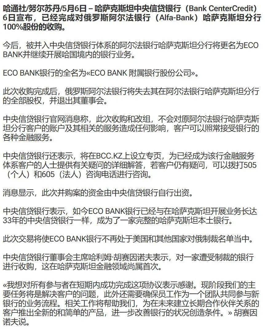 五月哈萨克斯坦中央信贷银行(Bank CenterCredit)对俄罗斯阿尔法银行(Alfa-Bank)哈萨克斯坦分行100%股份的收购,并继续开展哈国境内的银行业务.此次交易将使俄罗斯阿尔法银行(Alfa-Bank)哈萨克斯坦分行不再处于美国和其他国家对俄制裁名单当中。同时,哈萨克斯坦中央信贷银行(Bank CenterCredit)对俄交易将会更加顺畅。