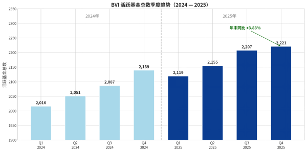 截至2025年12月31日,BVI辖区内活跃的共同基金及私募投资基金总数达到2,221支,较2024年末的2,139支增长了3.83% [1][2]。从连续八个季度的趋势来看,BVI活跃基金总数呈现出极强的韧性,每个季度均保持正增长。