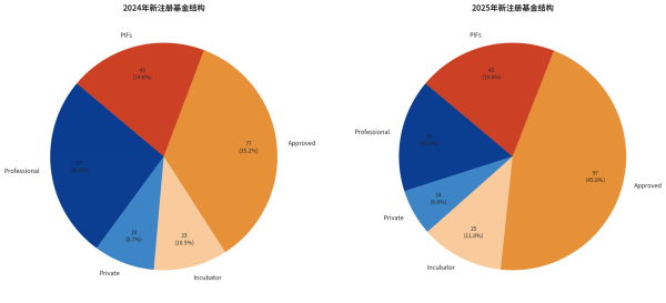 与专业基金的颓势形成鲜明对比的是,获批基金(Approved Funds)的新注册量从2024年的77支飙升至2025年的97支,增幅达到 26.0%。