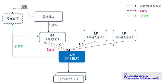 有限合伙企业是私募股权基金(PE/VC基金)常见的基金组织架构,以典型的开曼群岛合伙企业基金为例,其为根据《豁免有限合伙企业法》设立的豁免有限合伙企业(Exempted Limited Partnership),至少由一名普通合伙人(“GP”)以及一名有限合伙人(“LP”)组成。其中,GP承担无限责任,LP以其对基金的认缴出资额为限承担有限责任。除GP与LP以外,基金通常还需要管理公司进行管理(“MC”)。在基金结构相对简单且MC仅发起设立并管理该基金的情况下,一般GP可直接作为MC。