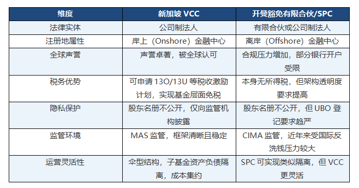 如果说开曼群岛的基金结构是上一个时代的经典之作,那么新加坡VCC则是为当前全球政经环境量身定制的升级版。下表清晰地展示了VCC相较于传统开曼基金的优势所在: