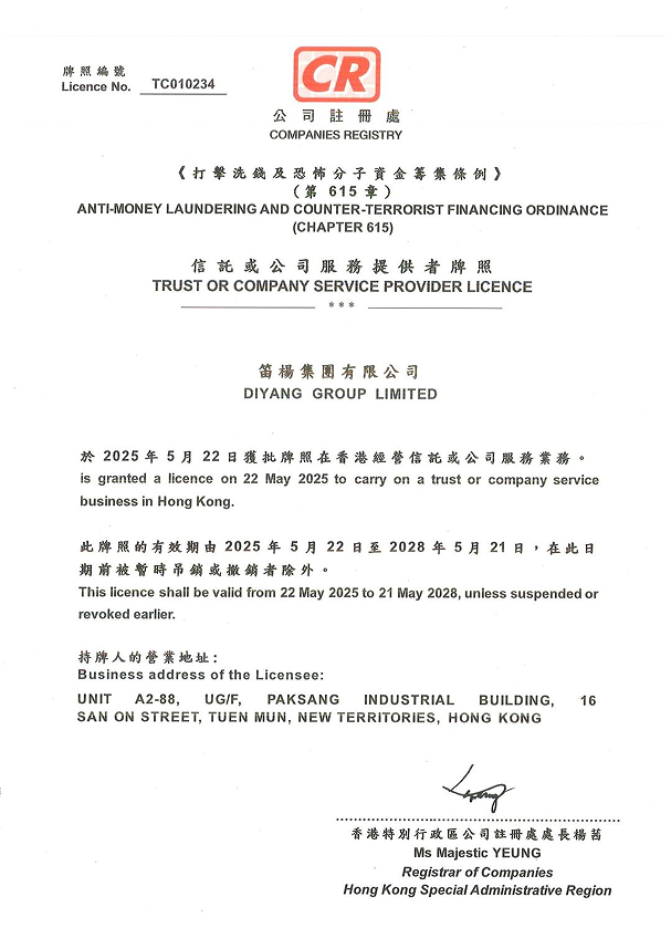 笛杨集团是持有香港信托或公司服务提供者牌照(TCSP) 的持牌机构(牌照编号:TC010234),以合规、专业、可靠为核心,服务网络覆盖全球多个主要商业中心。
