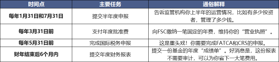 就像我们每年需要体检一样,你的孵化基金也需要完成一份“年度任务清单”,向监管机构证明你一切正常。记住下面这几个关键的时间点: