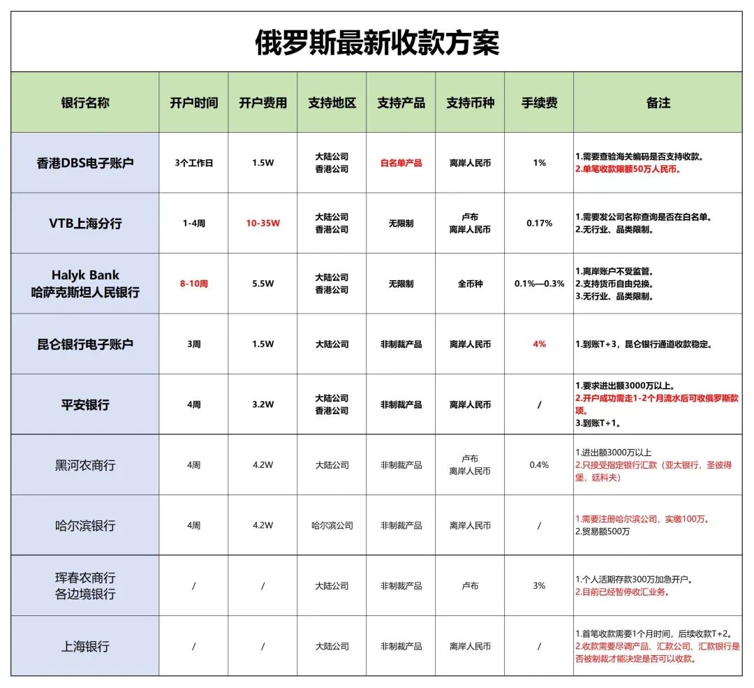 在当前全球经济格局不断演变、贸易环境日趋复杂的背景下,国际贸易的参与者们面临着前所未有的挑战与机遇。从俄*斯V*T银行的行内清算到哈*萨克斯坦人民银行的全币种支持,再到香港DBS电子账户的极速开户体验,各大银行纷纷推出各自的结算服务,以适应不同企业的跨境贸易需求。本文详细介绍的各个银行方案,旨在帮助企业根据自身的业务需求,选择最合适的跨境结算服务,以应对复杂多变的国际贸易环境。让我们携手合作,共同开拓更广阔的国际市场。