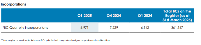 2025年Q1新注册商业公司(BCs)精确达6,971家(表1/P2),较2024年Q1的6,142家实现13.50%同比增长,环比2024年Q4的7,229家下降3.57%。截至2025年3月31日,注册实体总量锁定361,167家,保持全球离岸枢纽地位。