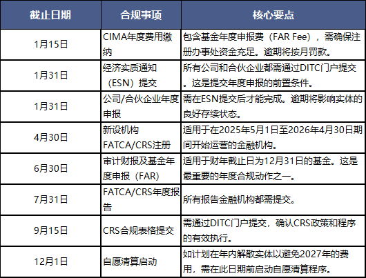 2026开曼合规日历:一份基金管理人不容错过的行动指南