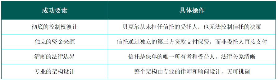 作者手记:贝克尔案的精髓在于“间接资助”(Indirect Funding)的理念。委托人仅提供启动资金,而将支付保费这一核心行为完全交由信托和第三方银行完成,从而在法律上彻底切断了与保单的直接联系。这是最高级别的专业操作。