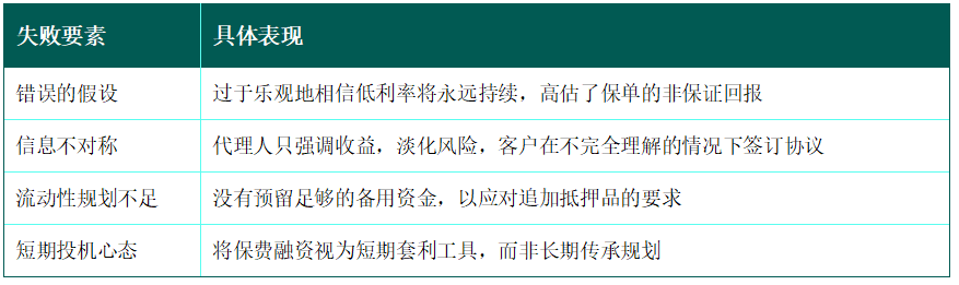 作者手记:失败案例最深刻的教训是:杠杆会同时放大收益和风险。在风平浪静时,它是财富的加速器;在惊涛骇浪中,它会成为压垮骆驼的最后一根稻草。任何承诺“无风险套利”的保费融资方案,都极有可能是通往陷阱的诱饵。