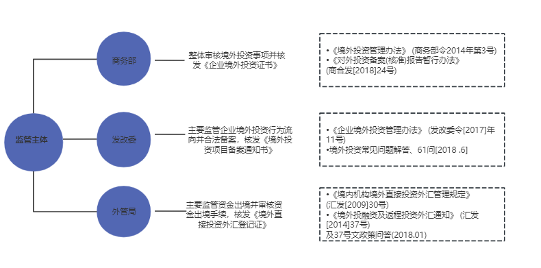 发改委核准或备案→商务部核准或备案→外汇管理局备案(银行放外汇,外管局监管)→实施ODI。