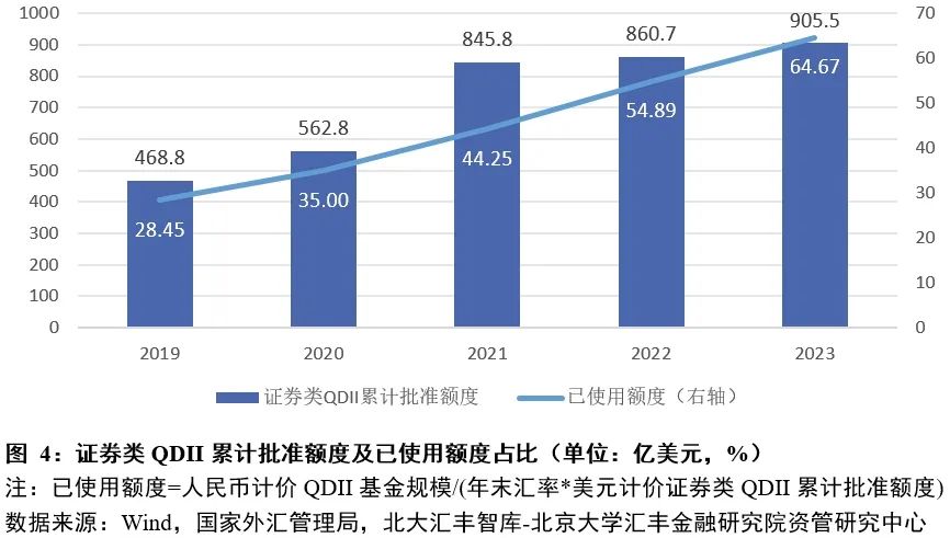 QDII额度不足一定程度影响了公募基金全球布局。近年来,已使用的QDII额度比例逐年上升(图 4)。额度紧张多次引起QDII基金限购[14]。例如,2024年5月7日,国泰基金旗下标普500ETF暂停申购,长信全球债券宣布暂停大额申购业务。在此之前,华夏纳斯达克100ETF、南方原油、广发道琼斯石油指数、交银中证海外中国互联网指数等海外基金也公告限购。Wind统计显示,截至2024年5月17日,617只QDII基金中,处于限购或“直接闭门谢客”状态的有338只,占比54.8%。此外,部分产品限购额度非常“迷你”,如景顺长城纳斯达克科技市值加权联接将单日申购限额定为10元,华夏海外收益、华夏大中华信用精选的每日申购上限是20元,易方达香港小型股指数、景顺长城纳斯达克科技ETF联接人民币、工银印度基金人民币等产品的单日申购上限为100元。过半QDII基金限购,背后是快速增长的规模和紧缺的QDII投资额度[15]