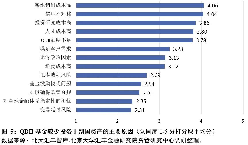 一方面,是调研投研成本。问卷结果显示,调研投研成本高以及信息不对称是阻碍公募基金实现全球布局最重要的因素。这包括时差、距离、出入境限制等因素导致的高调研成本,文化、语言等差异导致的信息不对称,以及交易机制、市场定价机制等差异导致的高投研成本。学术研究显示,由于本土信息优势,投资于本土企业可能获得更高的超额收益[10]。即使能够获取境外信息,本土信息优势形成的信息不对称仍是造成本土偏好的重要原因[11]