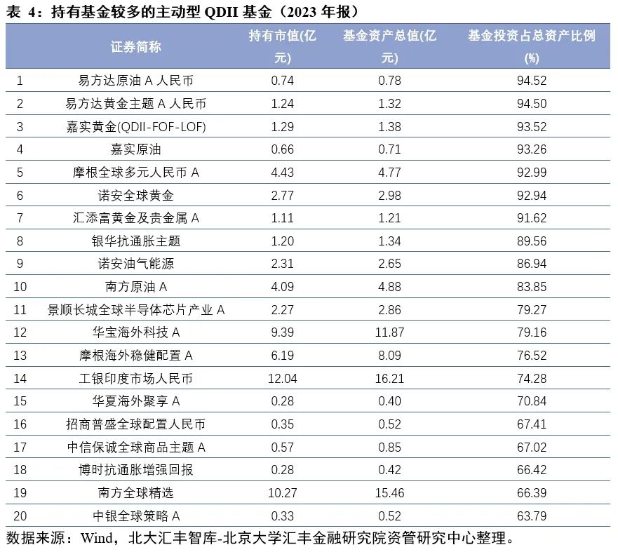 截至2023年末,被动型QDII基金规模中,47.15%跟踪香港市场指数,28.52%跟踪美国市场指数,23.16%跟踪中概股相关指数。跟踪指数行业分布方面,72.68%跟踪信息技术相关指数[6],16.09%跟踪宽基指数[7],6.90%跟踪医药相关指数[8],1.80%跟踪油气相关指数[9]。被动型QDII基金主要跟踪股票型指数,仅有少数跟踪REITs指数。主动型QDII基金中配置了相当体量的基金,持有基金市值达69.35亿元,占主动型QDII基金资产总值的7.45%。印度市场、黄金、全球主题的QDII基金往往更多持有基金(表 4)。虽然绝大部分QDII基金的名称里没有“FOF”字样,但实际为Fund of Funds。